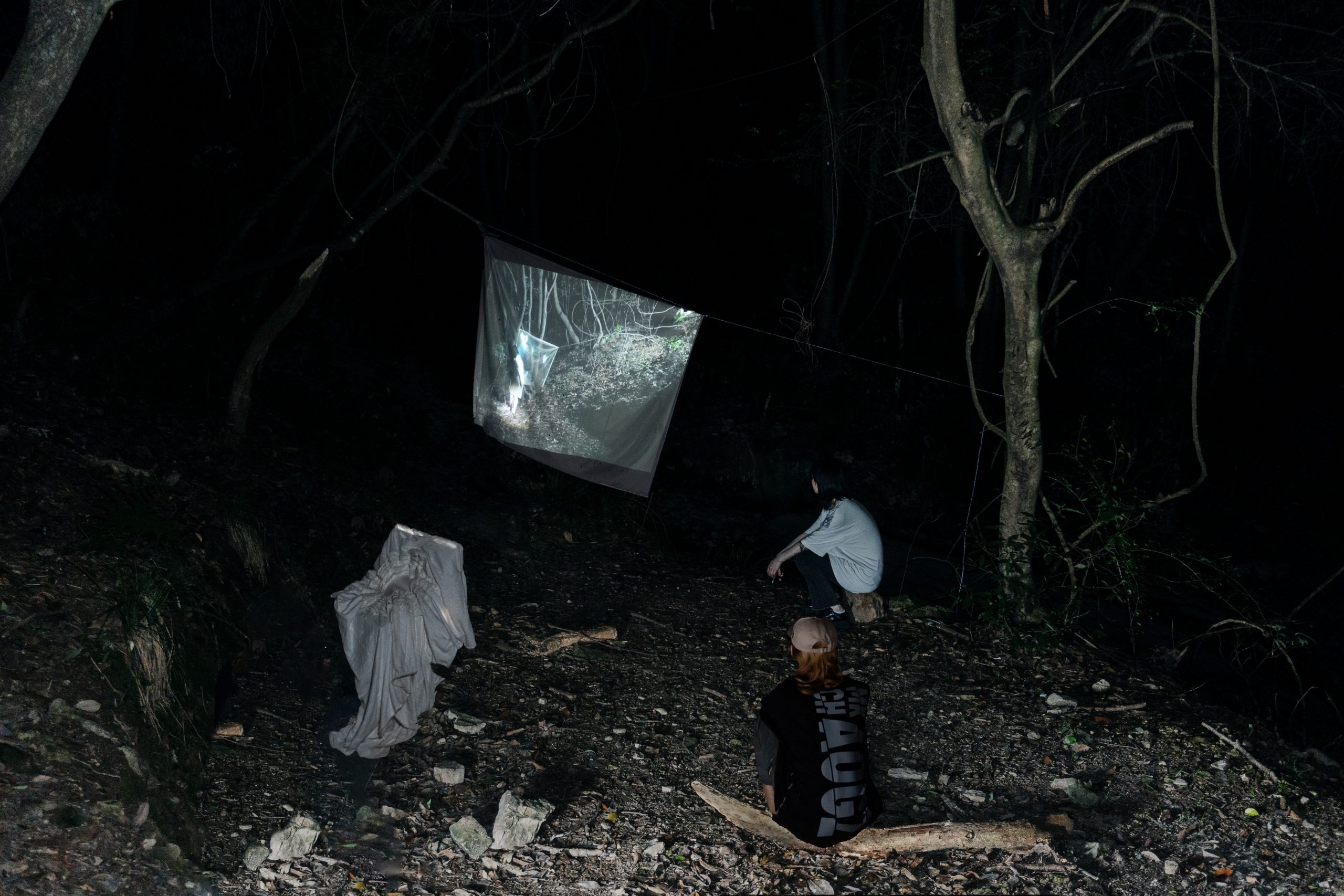 该行为表演以人在自然与城市之间情感徘徊作为剖面,探索人与自然共情连接的方式。选取了艺术家熟悉的一处山林,用纱布投影创造了一处阈限空间,试图打开被城市禁锢起来的树(人)与自然山林相遇的冲突与对话的过程。